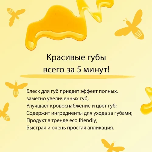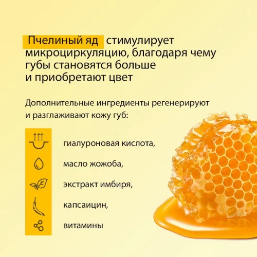 Блеск для губ с пчелиным ядом улучшает кровообращение, благодаря чему губы становятся более объемными. Гиалуроновая кислота в его составе помагает отлично ухаживать за нежной кожей губ.