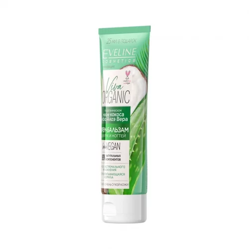 КРЕМ-БАЛЬЗАМ ДЛЯ РУК И НОГТЕЙ С КОКОСОМ И АЛОЭ ВЕРА обладает ультраувлажняющим эффектом, интенсивно восстанавливает кожу рук и смягчает кутикулу. Благодаря органическому кокосовому маслу в своем составе, крем для рук заметно улажняет кожу, защищает, повышает ее общий тонус, надолго сохраняя мягкой и шелковистой. Bio экстракт алоэ предупреждает возникновение воспалений, оказывает антибактериальное действие и эффективно борется с признаками старения. В креме-бальзаме Viva Organic содержится также масло ши. Оно регенерирует, глубоко питает и разглаживает кожу.