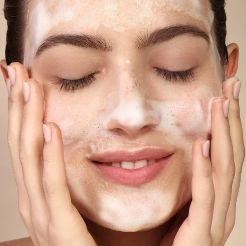 Небольшое количество пенки нанести на влажную кожу лица, избегая области вокруг глаз. Вспенить легкими массирующими движениями, затем смыть теплой водой.