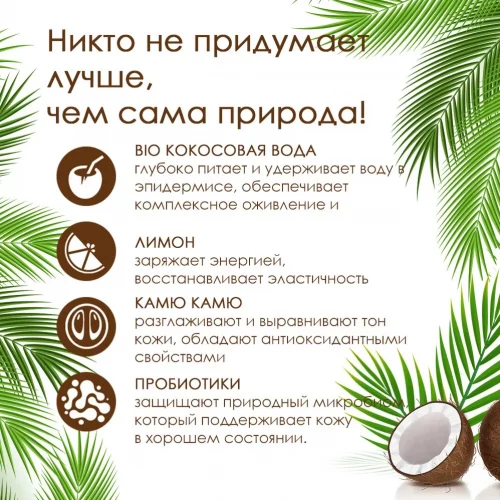 В составе формулы пенки для умывания содержится 96% компонентов натурального происхождения, основным из которых является bioкокосовая вода. Кроме того, в составе мицеллярной воды содержится экстракт малины, лимон, камю камю, а также пробиотики, которые защищают натуральный микробиом кожи. Пенка подойдет для всех типов кожи, в том числе чувствительной.