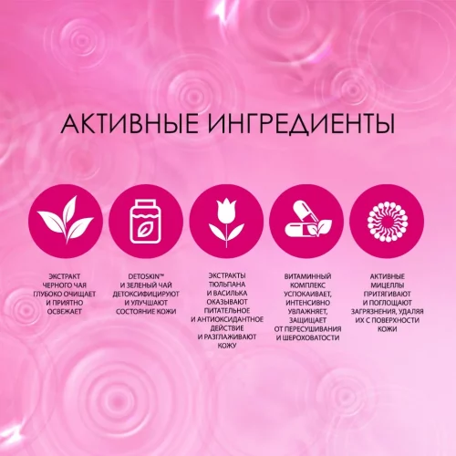 Экстракт черного чая в ее составе глубоко очищает, эффективно удаляет с поверхности кожи любые загрязнения и приятно освежает. Зеленый чай детоксифицируют и улучшает состояние кожи, а екстракты тюльпана и василька питают и оказывают антиоксидантное действие. Витаминный комплекс успокаивает, интенсивно увлажняет, защищает от сухости и шероховатости.