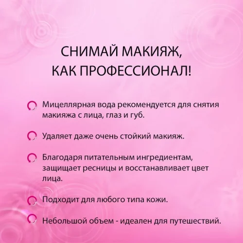 ПРОФЕССИОНАЛЬНАЯ МИЦЕЛЛЯРНАЯ ВОДА 3В1 создана специально для эффективного и мгновенного удаления долговременного и водостойкого макияжа. Ее активные мицеллы эффективно притягивают и впитывают загрязнения, удаляя их с поверхности кожи. Мицелярная вода не требует трения или смывания.