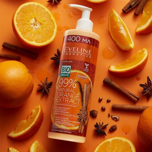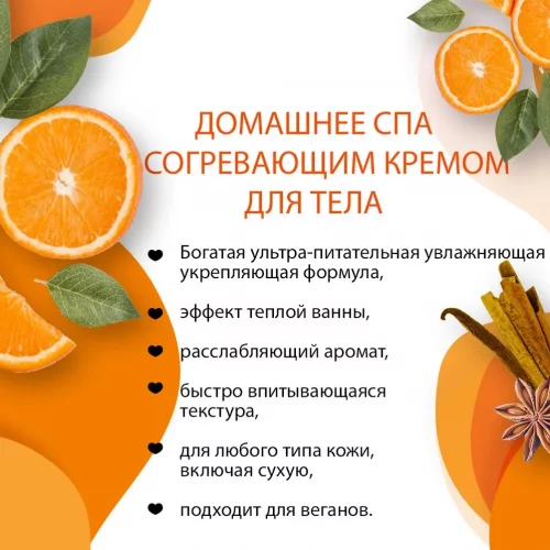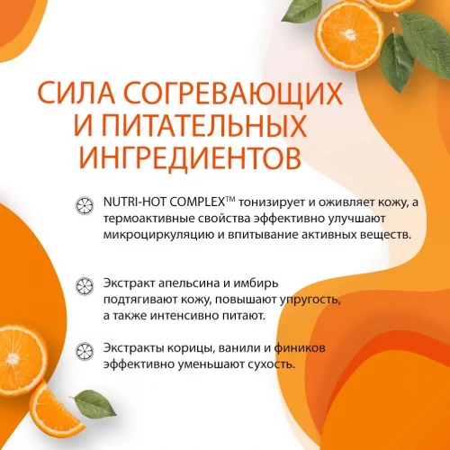 Веганская формула СОГРЕВАЮЩЕГО ПИТАТЕЛЬНО-УКРЕПЛЯЮЩЕГО КРЕМ-ГЕЛЯ ДЛЯ ТЕЛА была создана на основе 99% натурального экстракта апельсина, а также экстрапитательных компонентов, таких как имбирь, ваниль, корица и финики. Благодаря этому, крем-гель отлично питает и увлажняет кожу, придает ей гладкость и шелковистость, значительно улучшает микроциркуляцию кожи. Гель имеет термоактивные свойства, обусловленные технологией NUTRI–HOTCOMPLEX, которые способствуют более глубокому проникновению активных компонентов.
