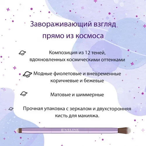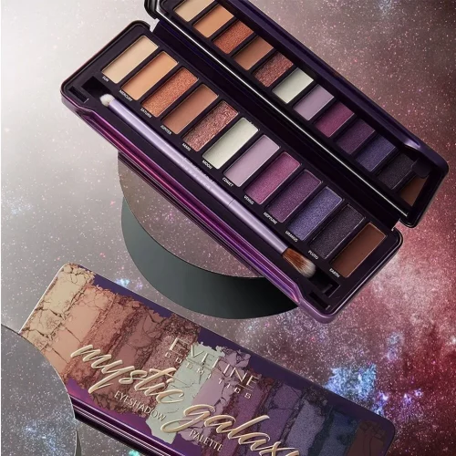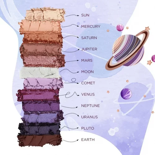 Тени для век MYSTIC GALAXY – это двенадцать оттенков, каждый из которых назван в соответствии с похожим цветом планеты нашей Солнечной системы. Тени обладают как матовым, так и дуохромным и металлическим финишем. Продукт легко наносится, наслаивается и растушевывается благодаря приятной шелковистой текстуре. После нанесения тени для век образуют плотное покрытие – они обладают отличной пигментацией. Вместе с палеткой теней MYSTIC GALAXY легко экспериментировать и создавать различные виды макияжей, например, нежные дневные или более яркие вечерние. Продукт отличается высокой стойкостью – тени не осыпаются и не скатываются в течение всего дня. Металлическая упаковка продукта содержит встроенное зеркало и профессиональную кисть, благодаря чему тени удобно брать с собой. Веганская формула.